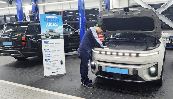 전기차의 경우, 기본 점검 항목 외 ▲주간 주행등 램프(앞) 점검 ▲배터리, 히터 및 모터용 냉각수량 및 누수 점검 ▲충전 인렛 커버 및 포트 상태 점검 ▲저전압 배터리 및 터미널 점검 ▲인터락 커넥터 체결상태(모터룸) 점검 ▲기타 커넥터 체결(VCU, MCU, BMS, LDC&OBC)를 점검한다.