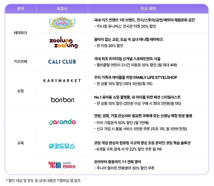 키즈 제휴사는 △티니핑월드 인 판교(테마파크) △주렁주렁(테마파크) △캘리클럽(키즈카페) △캐리마켓(쇼핑) △보리보리(쇼핑) △자란다(교육) △코드모스(교육) △YBM전화화상 주니어(교육) 등 신규 8개 제휴사 포함, 총 17개다.