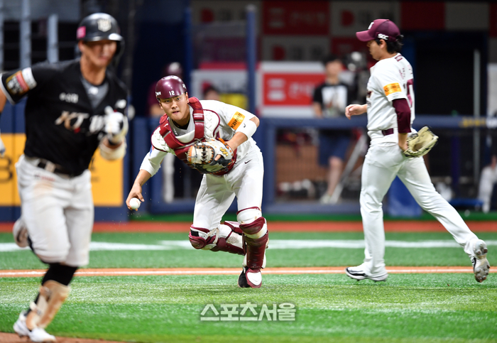 키움 포수 김건희가 18일 고척스카이돔에서 열린 2024 프로야구 키움히어로즈와 KT위즈의 경기 4회초 2사 1루 배정대의 땅볼을 잡아 1루로 송구하고 있다. 2024.07.18.