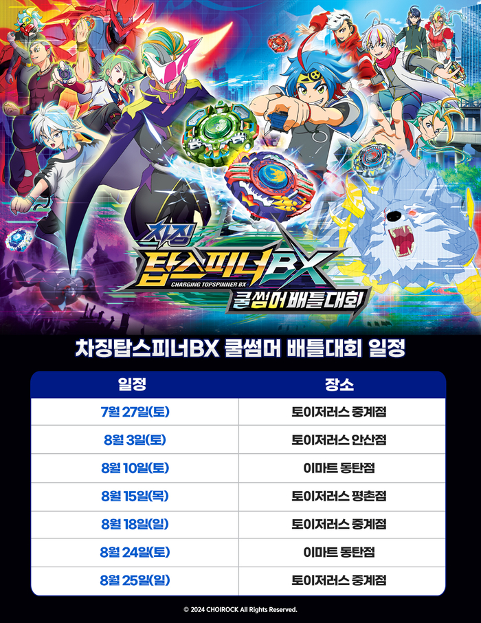 [스포츠서울 | 김효원 기자] 콘텐츠 전문 기업 초이락컨텐츠컴퍼니(대표 최종일)가 여름 주말마다 ‘차징 탑스피너BX 쿨썸머배틀대회’를 개최한다. 7월과 8월 주말마다 서울과 수도권의 대형마트에서 차징 탑스피너BX 팽이 배틀의 우승자를 가리는 대회가 펼쳐진다.