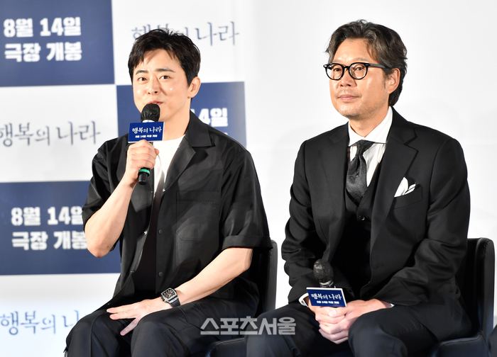 배우 조정석, 유재명이 22일 건대입구 롯데시네마에서 열린 영화 ‘행복의 나라’ 제작보고회 무대에 올라 질문에 답하고 있다. ‘행복의 나라’는 1979년 10.26 대통령 암살사건에 대한 대한민국 최악의 정치재판을 다룬 영화로 고인이 된 이선균의 유작이다.