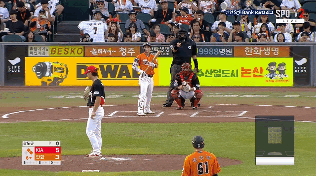 5-4까지 추격에 성공한 한화는 1사 2,3루에서 터진 대타 김인환의 3점 홈런으로 5-7 대역전에 성공한다. 관록의 베테랑 감독의 작전에 KIA가 순식간에 말려들었다.