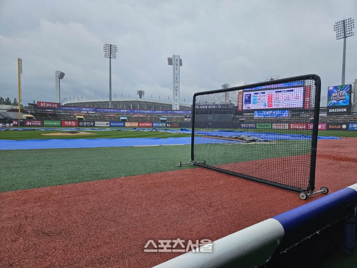 급하게 대형 방수포를 깔았다. 비가 잦아들기를 기다렸다. 그치지 않았다. 곳곳에 물웅덩이가 생겼다. 1루와 3루, 포수 후면 등은 물에 잠기다시피 했다. 결국 경기를 시작하지 못했다. 6시45분 경기 취소가 결정됐다.