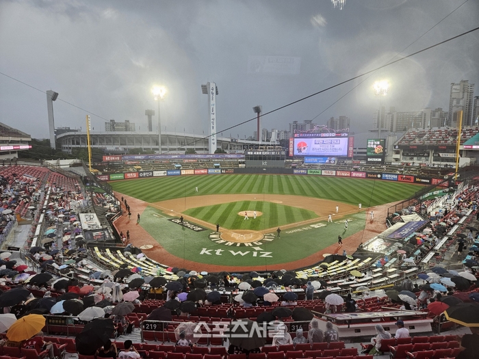 쿠에바스가 초구를 던지기 직전, 심판진이 선수단 철수를 지시했다. KBO 공식 기록에도 ‘1회초 1번타순 초구 전, 6시30분 우천 관련으로 경기개시 지연’으로 표시됐다.