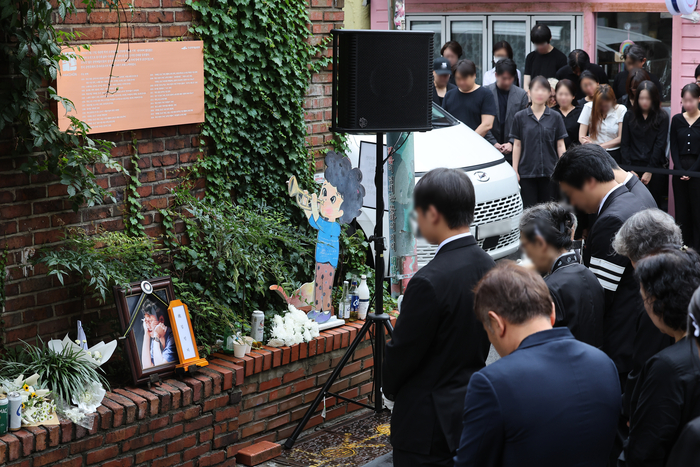 고인이 33년 간 일궈온 학전에서 마지막 인사를 한 유가족들과 전에서 꿈을 키운 후배들이 모여 추모의 뜻을 전했다. 이들은 학전 앞에서 함께 묵념하며 고인의 명복을 빌었다.