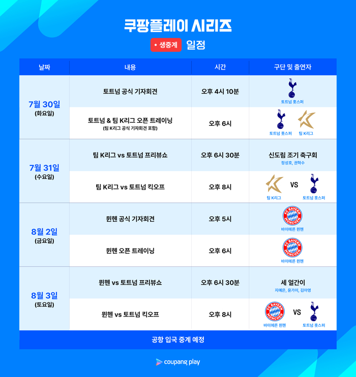 쿠팡플레이 시리즈의 중계는 토트넘의 주장 손흥민을 포함해 제임스 메디슨, 데얀 쿨루셉스키 등 선수들의 입국 현장을 실시간 전한다. 이후 FC 바이에른 뮌헨의 김민재와 토마스 뮐러, 주앙 팔리냐 등 선수들의 입국 장면도 담을 예정이다.