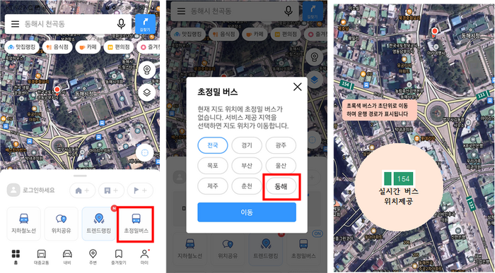 이용 방법은 카카오맵 앱을 설치하고 초정밀버스, 동해를 순서대로 선택하면 맵을 통해 운행 중인 버스 이동을 실시간으로 알 수 있다. 또한, 버스 아이콘을 선택하면 버스 전체경로, 버스 번호, 이동 방향 등 상세한 정보를 제공하고, 정류장을 선택하면 버스 노선별 대기시간을 알려준다.