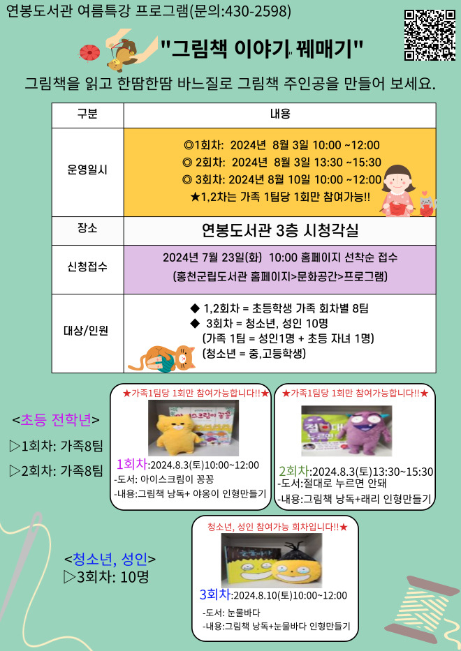 이번 프로그램은 8월 3일(오전 1회차, 오후 2회차) 초등학생 가족 8팀을 대상으로 그림책 낭독과 인형 만들기를 진행하고 10일(3회차)에는 청소년, 성인 10명을 대상으로 한다.