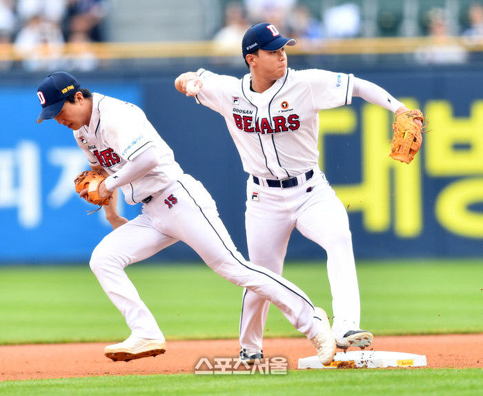 두산 유격수 박준영이 25일 잠실구장에서 열린 2024프로야구 두산베어스와 키움히어로즈의 경기 1회초 무사 1루 키움 2번 도슨의 타구를 잡아 2루를 찍고 1루로 송구해 병살처리하고 있다. 2024.07.25.