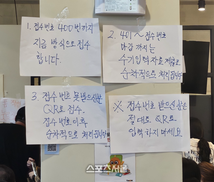 지하 1층에는 401번부터 접수번호 마감까지는 수기 입력자료를 제출하면 차례대로 처리된다는 안내문이 공지돼 있다. 또한 접수번호를 못 받은 피해자는 QR로 접수를 안내하고 있다.