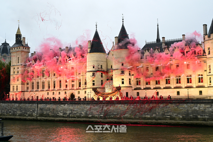 26일(현지시간) 프랑스 파리 센강 일대에서 열린 2024 파리올림픽 개회식중 선수들이 이동하는 강변 옆 콩시에르주리에서 공연이 펼쳐지고 있다.