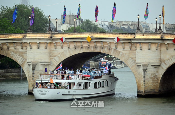스포츠 | 스포츠일반 [포토]대한민국 선수단, 유명한 퐁뇌프 아래로... 입력2024-07-27 05:57:58 북마크 페이스북 트위터 SNS 더보기 가글자크기설정 인쇄 SNS 더보기 닫기 네이버밴드 네이버블로그 URL복사 글자크기 설정 메뉴 닫기 글자크기 설정 시 다른 기사의 본문도동일하게 적용됩니다. 가 가 가 가 가 대한민국 올림픽 선수단이 26일(현지시간) 프랑스 파리 센강 일대에서 열린 2024 파리올림픽 개회식에 참석하기 위해 배를 타고 퐁뇌프를 통과하고 있다.2024. 7. 26. 사진공동취재단 기사추천 0