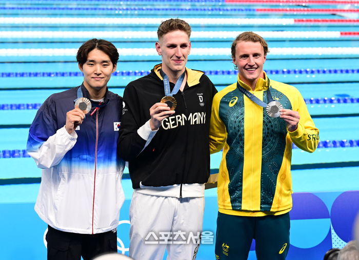 수영 대표팀의 김우민(왼쪽)이 27일(현지 시간) 프랑스 파리 라 데팡스 아레나에서 열린 2024 파리올림픽 수영 자유형 400m 결선에서 3위로 동메달을 차지한 뒤 금메달의 루카스 메르텐스(독일, 가운데), 은메달의 엘리자 위닝턴(호주)와 함께 취재진을 향해 메달을 들어보이고 있다. 2024. 7. 27.