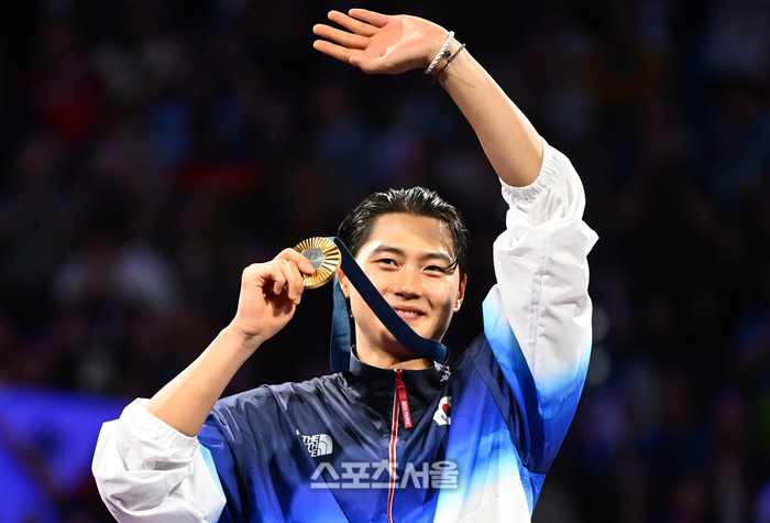 펜싱 국가대표 오상욱이 28일(한국 시간) 프랑스 파리 그랑팔레에서 열린 파리올림픽 펜싱 남자 사브르 개인전 결승에서 금메달을 딴 뒤 기념촬영을 하고 있다. 2024. 7. 28