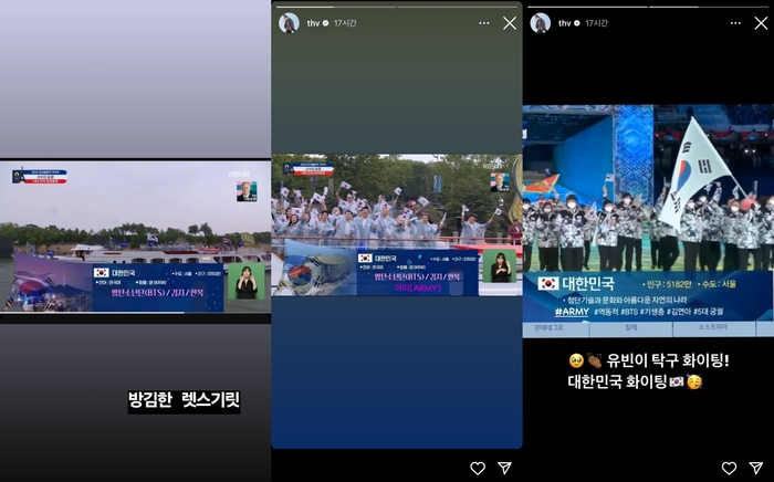 [스포츠서울 | 원성윤 기자] K팝 대표 보이그룹 방탄소년단 멤버 RM과 뷔가 KBS 파리올림픽 중계 시청을 인증했다. 이들은 KBS의 개막식 중계 화면과 ‘탁구 삐약이’ 신유빈에 대한 응원 메시지를 개인 SNS에 올렸다.