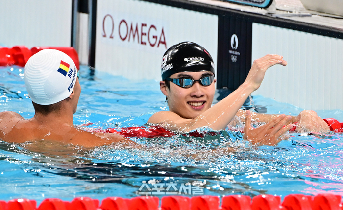 수영 대표팀의 황선우(오른쪽)가 28일(한국 시간) 프랑스 파리 라 데팡스 아레나에서 열린 2024 파리올림픽 수영 자유형 200m 예선에서 역영을 마친 뒤 다비드 포포비치(루마니아)와 하이파이브를 하고 있다. 황선우는 전체 4위, 포포비치는 전체 1위로 준결선에 진출했다. 2024. 7. 28.