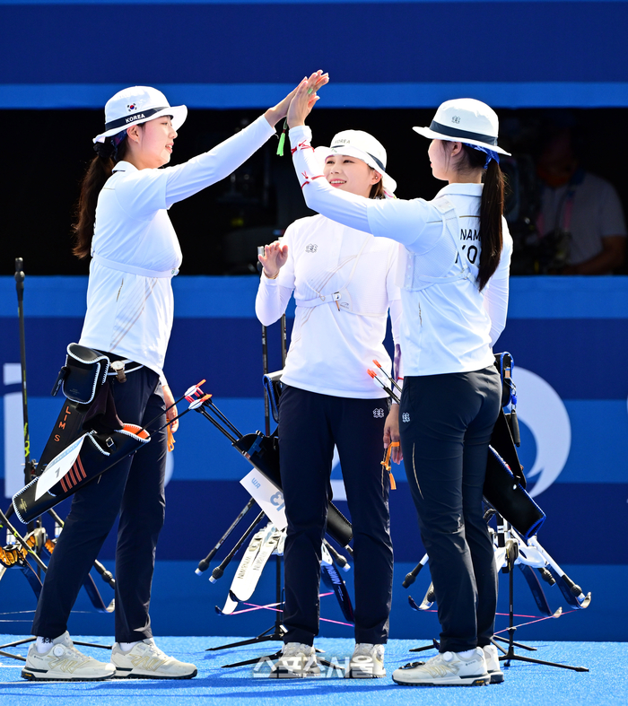 프랑스 파리 앵발리드에서 열린 2024 파리올림픽 양궁 여자 리커브 단체 대만과의 8강전에서 승리한 뒤 하이파이브를 나누고 있다. 2024. 7. 28.