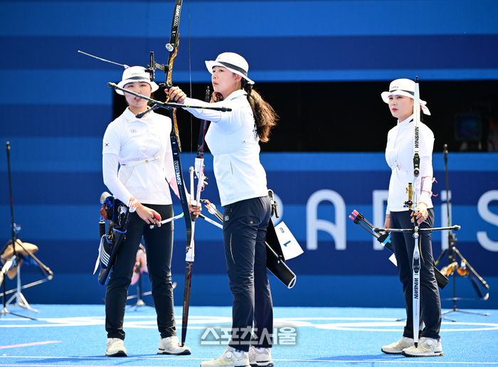 프랑스 파리 앵발리드에서 열린 2024 파리올림픽 양궁 여자 리커브 단체 대만과의 8강전에서 화살을 쏘고 있다. 2024. 7. 28.