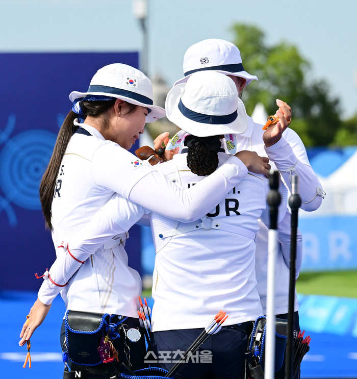 프랑스 파리 앵발리드에서 열린 2024 파리올림픽 양궁 여자 리커브 단체 결승에서 중국을 꺾고 10회 연속 금메달의 대기록을 달성한 뒤 눈물을 훔치며 포옹하고 있다. 2024. 7. 28.