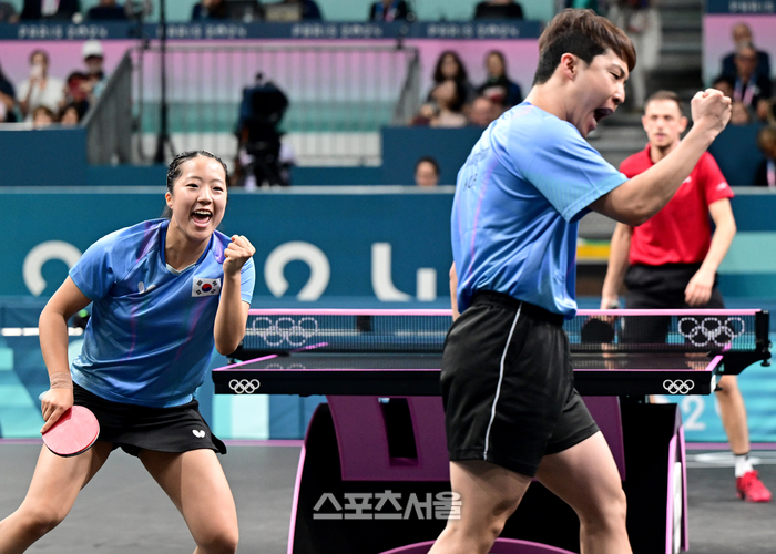 탁구 대표팀의 임종훈(오른쪽)-신유빈 조가 28일(한국 시간) 프랑스 파리 사우스 파리 아레나 4에서 열린 2024 파리올림픽 탁구 혼성 복식 8강전 루마니아의 오비디우 이오네스쿠-베르나데트 쇠츠?조와 경기에서 공격에 성공한 뒤 환호하고 있다. 임종훈-신유빈 조는 준결승전에 진출했다. 2024.07.28