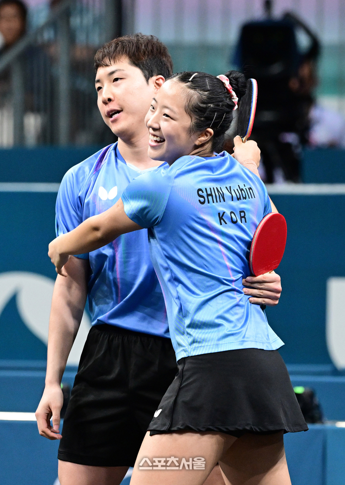 탁구 대표팀의 임종훈(왼쪽)-신유빈 조가 28일(한국 시간) 프랑스 파리 사우스 파리 아레나 4에서 열린 2024 파리올림픽 탁구 혼성 복식 8강전 루마니아의 오비디우 이오네스쿠-베르나데트 쇠츠?조에 승리한 뒤 환호하고 있다. 임종훈-신유빈 조는 준결승전에 진출했다. 2024.07.28