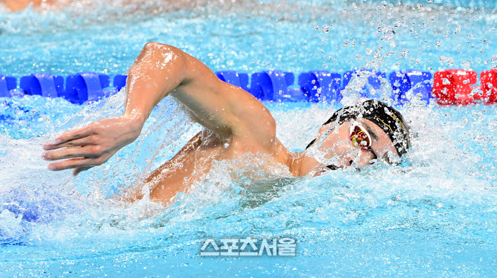 수영 대표팀의 김우민이 29일(한국 시간) 프랑스 파리 라 데팡스 아레나에서 열린 2024 파리올림픽 수영 자유형 200m 준결선에서 역영을 하고 있다. 황선우와 김우민은 전체 9위와 12위로 나란히 결선 진출에 실패했다. 2024. 7. 29.