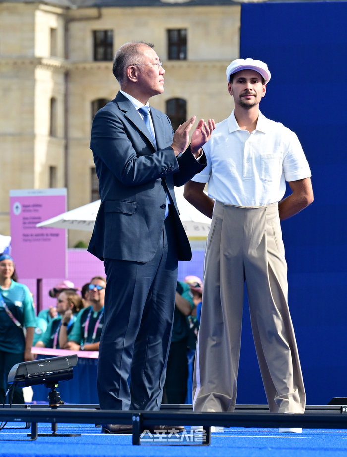 프랑스 파리 앵발리드에서 열린 2024 파리올림픽 양궁 여자 리커브 단체 시상식에서 10회 연속 금메달을 차지한 대표팀에게 박수를 보내고 있다. 2024. 7. 28.