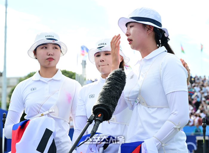 프랑스 파리 앵발리드에서 열린 2024 파리올림픽 양궁 여자 리커브 단체 결승에서 중국을 꺾고 10회 연속 금메달의 대기록을 달성한 뒤 인터뷰를 하다 눈물을 훔치자 남수현(왼쪽)과 전훈영이 다독이고 있다. 2024. 7. 28.