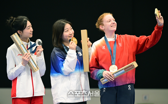 사격 국가대표 반효진(가운데)이 29일(한국시간)?프랑스 샤토루 슈팅센터에서 열린?2024 파리올림픽 공기소총 10m 여자 개인전 결선에서 올림픽 신기록으로 대한민국 역대 올림픽 100번째 금메달을 따낸 뒤 은메달 황위팅(중국, 왼쪽), 오드리 고그니아(스위스)와 기념촬영을 하고 있다. 2024. 7. 29.