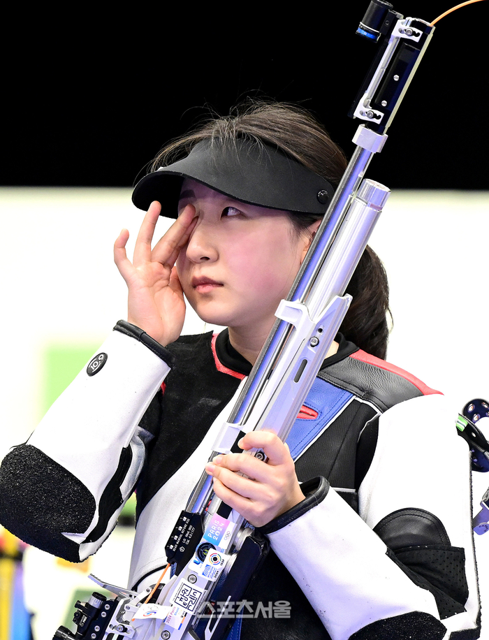 사격 국가대표 반효진이 29일(한국시간)?프랑스 샤토루 슈팅센터에서 열린?2024 파리올림픽 공기소총 10m 여자 개인전 결선에서 올림픽 신기록으로 대한민국 역대 올림픽 100번째 금메달을 따낸 뒤 눈물을 훔치고 있다. 2024. 7. 29.