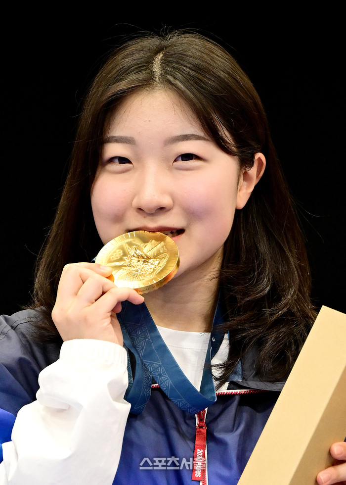 사격 국가대표 반효진이 29일(한국시간)?프랑스 샤토루 슈팅센터에서 열린?2024 파리올림픽 공기소총 10m 여자 개인전 결선에서 올림픽 신기록으로 대한민국 역대 올림픽 100번째 금메달을 따낸 뒤 기념촬영을 하고 있다. 2024. 7. 29.
