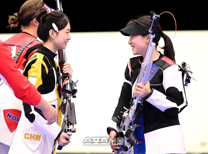 사격 국가대표 반효진(오른쪽)이 29일(한국시간)?프랑스 샤토루 슈팅센터에서 열린?2024 파리올림픽 공기소총 10m 여자 개인전 결선에서 올림픽 신기록으로 대한민국 역대 올림픽 100번째 금메달을 따낸 뒤 접전을 벌렸던 황위팅(중국)과 이야기를 나누고 있다. 2024. 7. 29.
