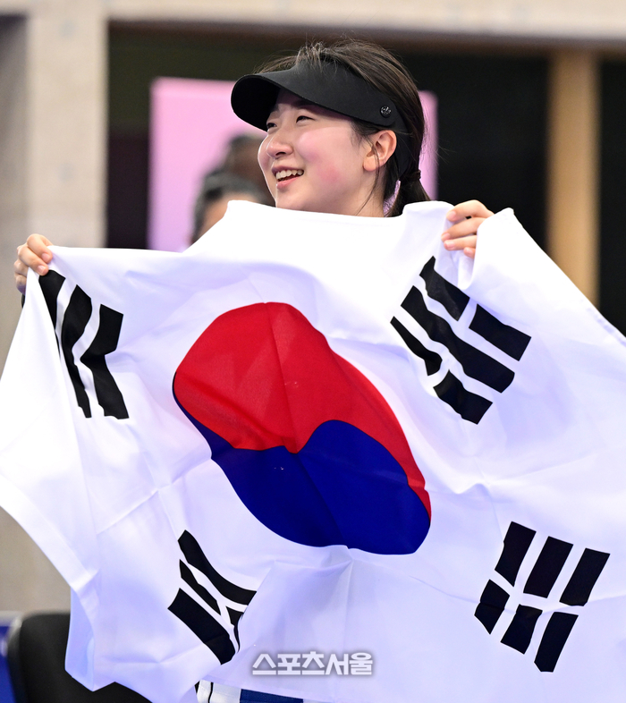 사격 국가대표 반효진이 29일(한국시간)?프랑스 샤토루 슈팅센터에서 열린?2024 파리올림픽 공기소총 10m 여자 개인전 결선에서 올림픽 신기록으로 대한민국 역대 올림픽 100번째 금메달을 따낸 뒤 태극기를 들어보이고 있다. 2024. 7. 29.