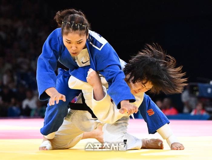 유도 국가대표 허미미(오른쪽)가 29일(한국시각) 파리 샹드마르스 아레나에서 열린 여자유도 -57㎏ 8강전에서 몽고 엔흐릴린 르하그바토를 상대하고 있다. 허미미는 절반승으로 4강에 진출했다. 2024. 7. 29.