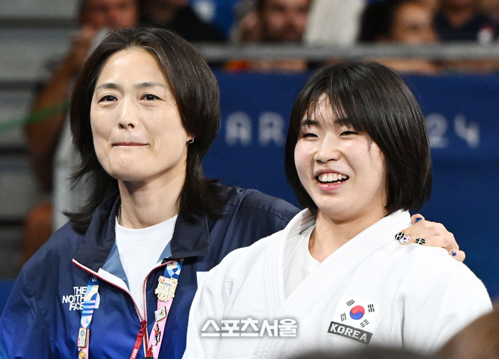 유도 국가대표 허미미(오른쪽)가 29일(한국시각) 파리 샹드마르스 아레나에서 열린 여자유도 -57㎏ 8강전에서 몽고 엔흐릴린 르하그바토를 상대하며 4강에 진출한 뒤 김미정 감독과 환하게 웃고 2024. 7. 29.