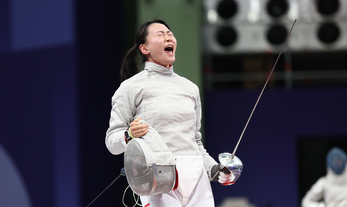 최세빈은 29일 프랑스 파리 그랑 펠레에서 열린 2024 파리올림픽 펜싱 사브르 8강전에서 전하영과 접전 끝에 15-14로 이겼다.