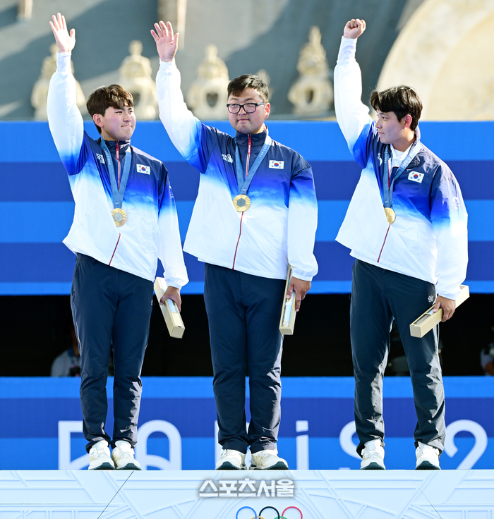 프랑스 파리 앵발리드에서 열린 2024 파리올림픽 양궁 남자 리커브 단체 결승전에서 프랑스를 꺾고 금메달을 딴 뒤 시상대에 올라 인사를 하고 있다. 한국 남자 양궁은 올림픽 3연패를 달성했다. 2024. 7. 30.