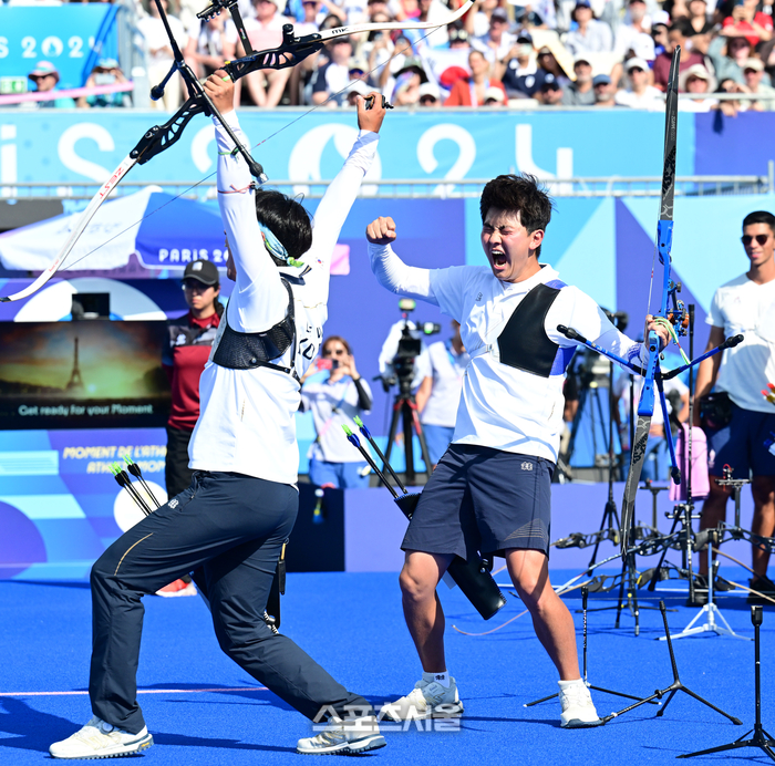 프랑스 파리 앵발리드에서 열린 2024 파리올림픽 양궁 남자 리커브 단체 결승전에서 프랑스를 꺾고 금메달을 확정한 순간 기뻐하고 있다. 한국 남자 양궁은 올림픽 3연패를 달성했다. 2024. 7. 30.