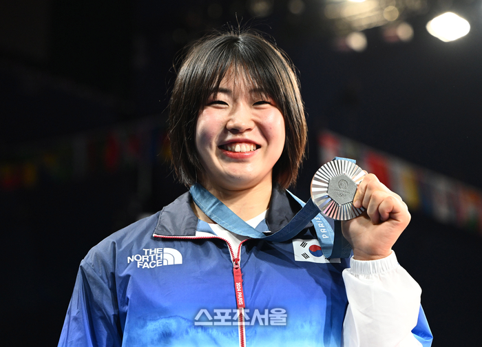 유도 국가대표 허미미(왼쪽)가 29일(한국시각) 파리 샹드마르스 아레나에서 열린 여자유도 -57㎏ 결승전에서 캐나다의 데구치에게 패해 은메달을 딴 뒤 메달을 들어보이며 미소를 짓고 있다. 2024. 7. 29.