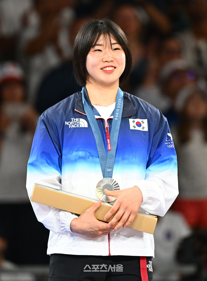 유도 국가대표 허미미(왼쪽)가 29일(한국시각) 파리 샹드마르스 아레나에서 열린 여자유도 -57㎏ 결승전에서 캐나다의 데구치에게 패해 은메달을 딴 뒤 시상대 위에서 미소를 짓고 있다. 2024. 7. 29.