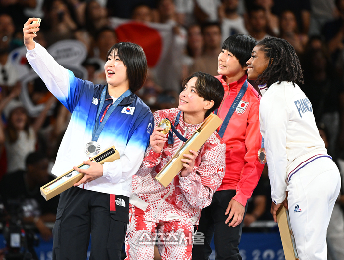 유도 국가대표 허미미(맨 왼쪽)가 30일(한국시각) 파리 샹드마르스 아레나에서 열린 여자유도 -57㎏에서 은메달을 딴 뒤 금메달 캐나다 데구치, 동메달 일본 후나쿠보, 프랑스 시지케와 함께 기념촬영을 하고 있다. 2024. 7. 30.