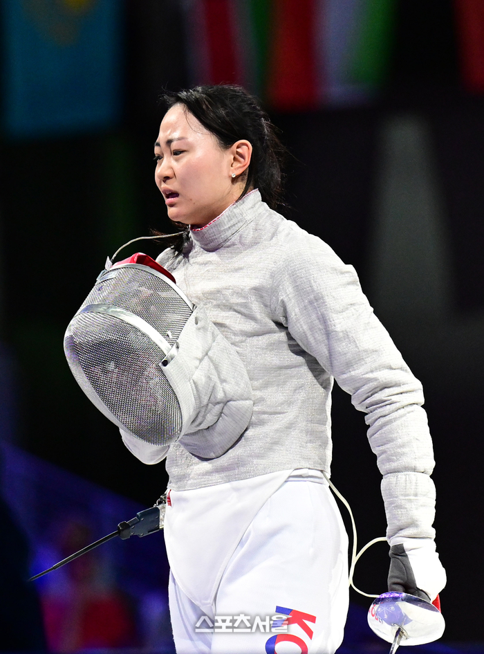 펜싱 대표팀의 최세빈이 30일(한국 시간) 프랑스 파리 그랑팔레에서 열린 2024 파리올림픽 펜싱 여자 사브르 동메달 결정전에서 우크라이나의 올가 칼란에게 실점한 뒤 아쉬워하고 있다. 최세빈은 올가 칼란에게 14-15로 석패하며 메달 획득에 실패했다. 2024. 7. 30.