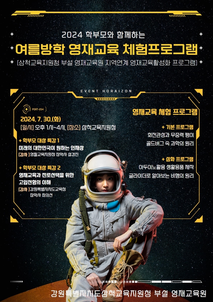 [스포츠서울ㅣ김기원기자]강원특별자치도삼척교육지원청(교육장 신순금)은 7월 30일(화) 지역 내 학생과 학부모를 대상으로 맞춤형 영재교육 지원을 위한 ‘학부모와 함께하는 여름방학 영재교육 체험 프로그램’을 운영한다.