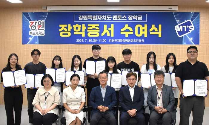 [스포츠서울ㅣ춘천=김기원기자]강원인재육성평생교육진흥원(원장 김학철, 이하 ‘인평원’)은 7월 30일, 맨토스그룹과 함께 도 출신 경영학 전공 우수인재에게 장학금을 수여하는 ‘강원특별자치도 맨토스 장학금 장학증서 수여식’을 개최했다.