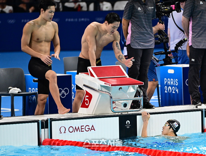 수영 남자 계영 대표팀의 김우민(아래)가 30일(한국 시간) 프랑스 파리 라 데팡스 아레나에서 열린 2024 파리올림픽 수영 계영 200mx4 예선에서 마지막 영자로 역영을 펼친 뒤 이호준-이유연의 격려를 받고 있다. 대표팀은 전체 7위로 결선에 진출했다. 2024. 7. 30.