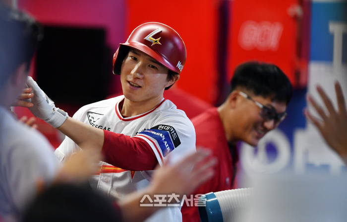 SSG 5번타자 박성한이 30일 인천SSG랜더스필드에서 열린 2024프로야구 SSG랜더스와 롯데자이언츠의 경기 6회초 선두타자로 나와 우월 1점홈런을 터트린 후 홈인하고 있다.. 2024.07.30.