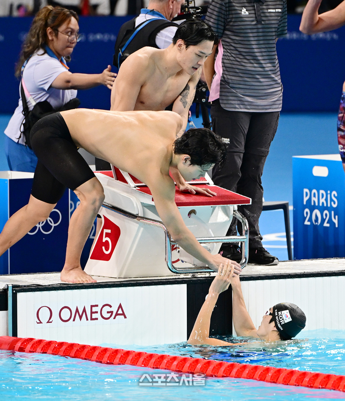 수영 남자 계영 대표팀의 김우민(아래)가 30일(한국 시간) 프랑스 파리 라 데팡스 아레나에서 열린 2024 파리올림픽 수영 계영 200mx4 예선에서 마지막 영자로 역영을 펼친 뒤 이호준(가운데), 이유연의 격려를 받고 있다. 대표팀은 전체 7위로 결선에 진출했다. 2024. 7. 30.