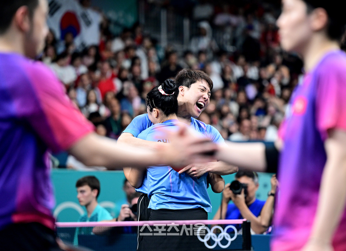 탁구 대표팀의 임종훈(왼쪽)-신유빈 조가 30일 (한국 시간) 프랑스 파리 사우스 파리 아레나4에서 열린 2024 파리올림픽 탁구 혼성 복식 동메달결정전에서 홍콩의 웡춘팅-두호이켐 조에 승리하며 동메달을 따낸 순간 환호하고 있다. 2024.07.30