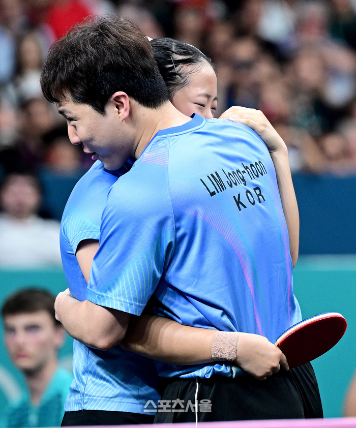 탁구 대표팀의 임종훈(왼쪽)-신유빈 조가 30일 (한국 시간) 프랑스 파리 사우스 파리 아레나4에서 열린 2024 파리올림픽 탁구 혼성 복식 동메달결정전에서 홍콩의 웡춘팅-두호이켐 조에 승리하며 동메달을 따내고 포옹을 하고 있다. 2024.07.30