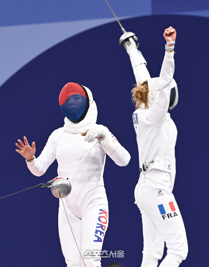 펜싱 여자 대표팀의 송세라가 30일(한국 시간) 프랑스 파리 그랑팔레에서 열린 2024 파리올림픽 펜싱 여자 에페 단체전에서 패한 뒤 아쉬워하고 있다. 한국은 31-37로 패하며 준결승 진출이 좌절됐다. 2024. 7. 30.